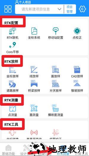 4、点击RTK测量进入RTK配置、RTK放样、RTK工具等功能模块,适用于高精度实时动态定位任务。