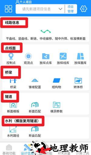 2、点击底部设置信息菜单后,进入界面选择所需模块如线路、桥梁或隧道,导入或编辑相关设计参数。