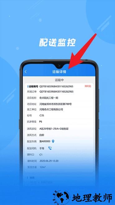 4、配货监控功能支持查看运输单详情,包括项目名称、地址及司机配送信息。