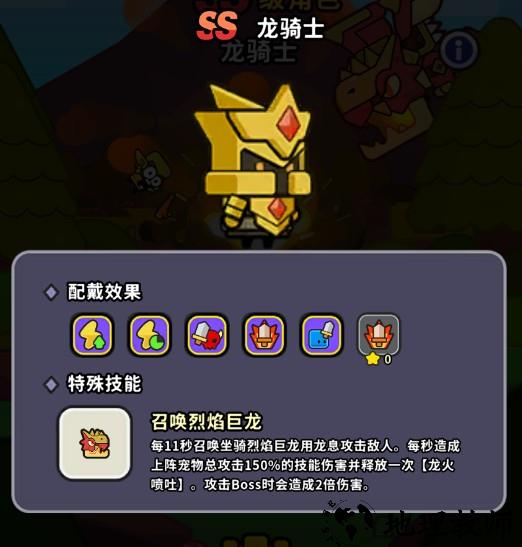 技能: 每11秒召唤烈焰巨龙,喷吐龙息,每秒造成上阵宠物总攻击150% 的巨额范围伤害,对Boss造成双倍伤害。