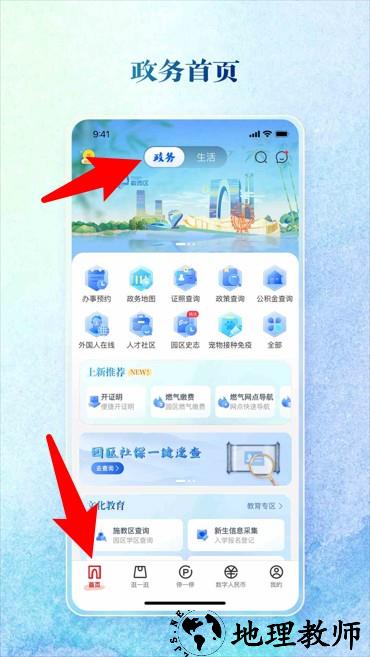 1.点击页面下方首页按钮并切换至政务页签,即可进入数字玄鸡湖政务服务首页。