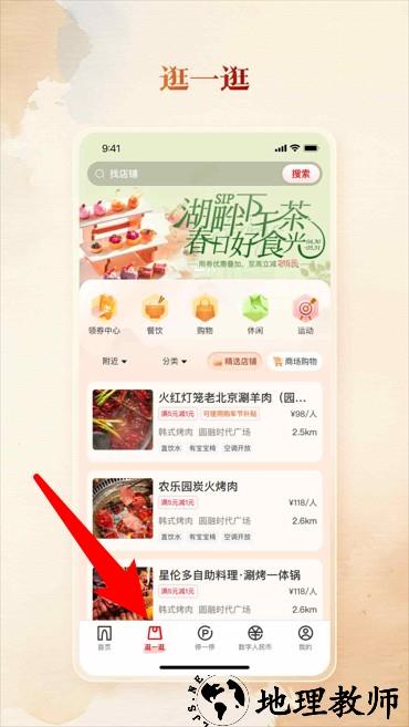 3.在逛一逛中查看美食推荐与团购优惠信息,点击底部导航栏可切换至相关功能区。