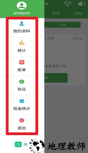 2、侧边栏菜单可查看个人资料、订单统计、账单记录及提现相关的现金统计功能。
