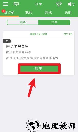 3、新订单界面显示当前可接单任务,骑手可根据地址和时间点击抢单按钮接单。