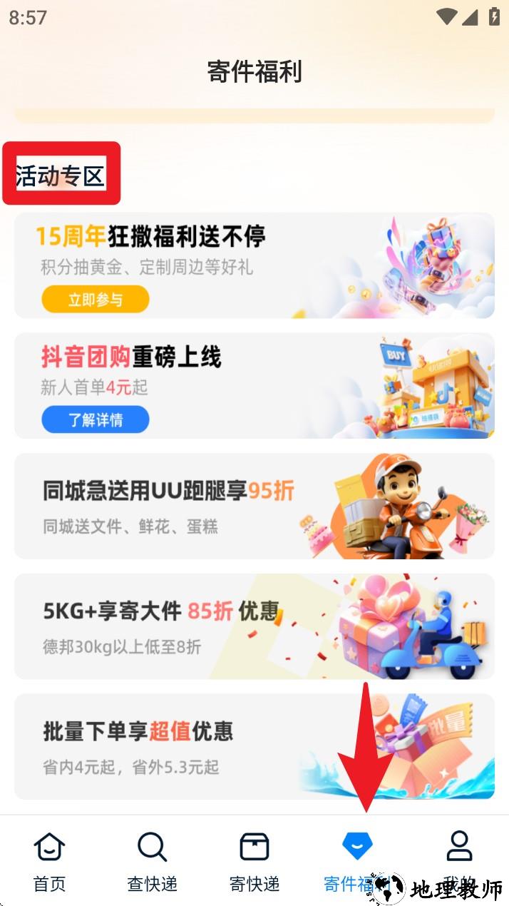 4.进入寄件福利页可参与活动专区,享受运费折扣、优惠券发放及专属寄件补贴,寄得多省得多。