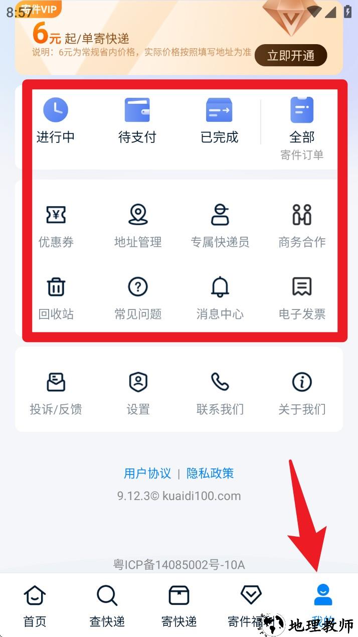 5.进入我的页面查看全部订单状态,管理地址、快递员、电子发票及消息通知,支持个性化设置与反馈。