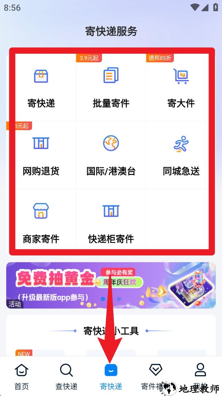 3.点击寄快递标签进入寄件服务页,支持批量寄件、网购退货、商家寄件等多种类型,选择更灵活。