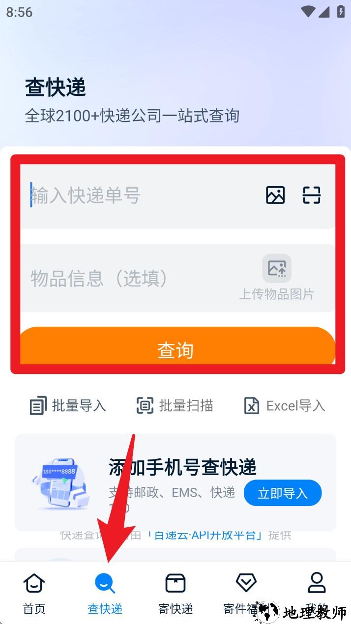 2.点选底部查快递,输入快递单号或扫码查询包裹状态,支持添加物品信息和图片,方便多单管理。
