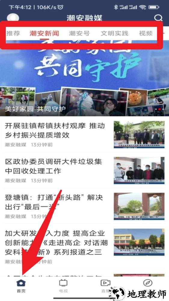 1.进入首页后,点击顶部潮安新闻等栏目标签,可切换查看推荐、号外、视频等不同资讯内容。