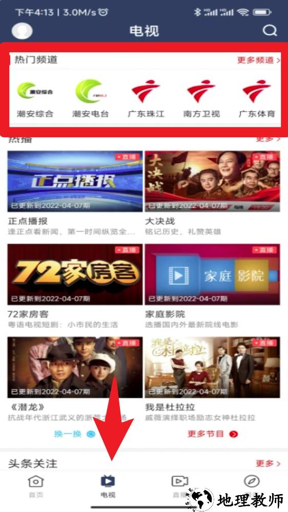 2.切换到底部电视页面,浏览潮安综合、潮安电台等频道,点击任意图标即可开始观看直播节目。