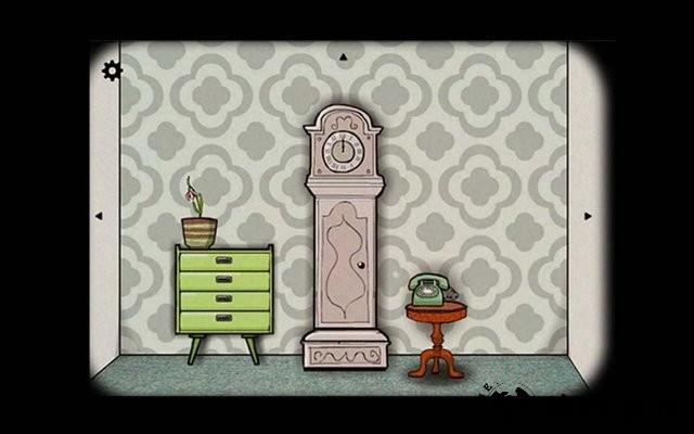 我们依然先是默认的面对有大型钟的这面,在盆栽柜子上拿到望远镜,然后一直点击盆栽,就发现一直手深了出来,又缩了回去,可以拿到第一篇相框碎片。抽屉里面可以取得螺丝刀,火柴,柜子边上还有一片碎片,房间钟的上方也可以取得一片碎片。