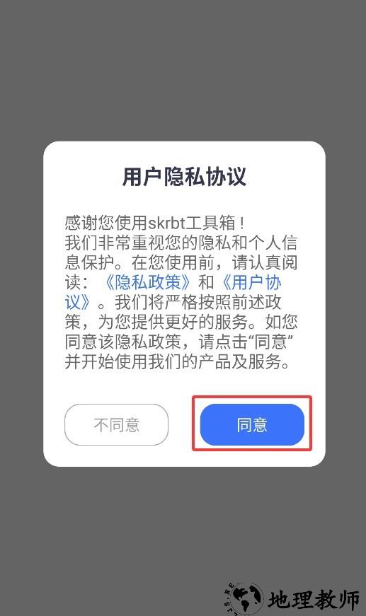 1、新注册者首次启动skrbt工具箱,点击弹窗“同意”选项,即可进入主界面开启使用。