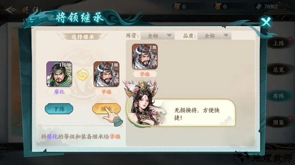 ps:上阵将领可无损「继承」等级与装备,故只需要升5个上阵将领即可。