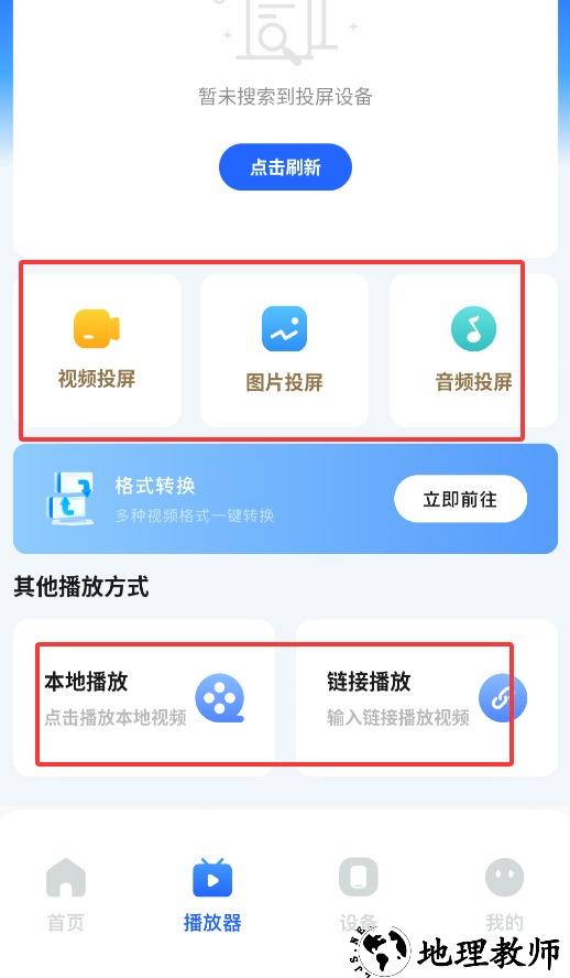 3、播放器支持本地及在线音视频投屏,并可进行链接播放与多格式兼容。