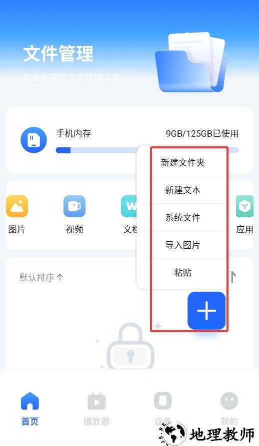 2、首页支持查看图片、视频等文件,点击右下角可新建文件夹或导入系统文件。