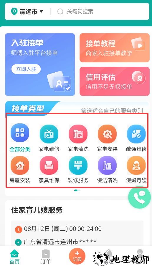 4、订单中心分类展示服务中、待接单、已完成等状态,方便管理接单进度。