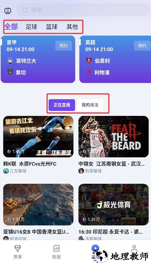 2、直播板块支持按足球、篮球等分类观看赛事,可关注频道并查看实时直播。