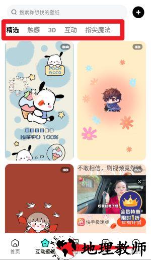 3、点击底部互动壁纸可浏览3D、触感、指尖魔法等特效类型的壁纸,支持实时预览并设置。