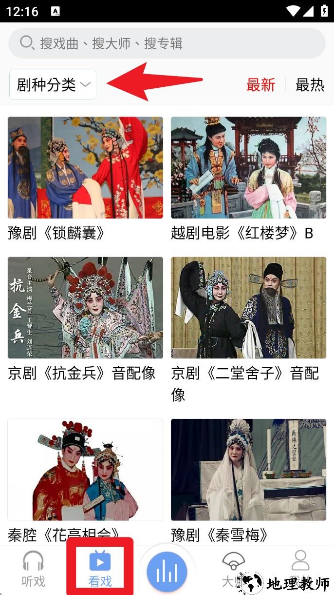 2. 切换到底部看戏栏目,可观看整段戏曲视频,支持查看剧种分类、最新上架与热门内容,方便用户按喜好选择。