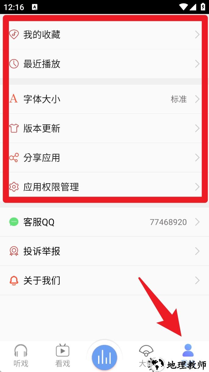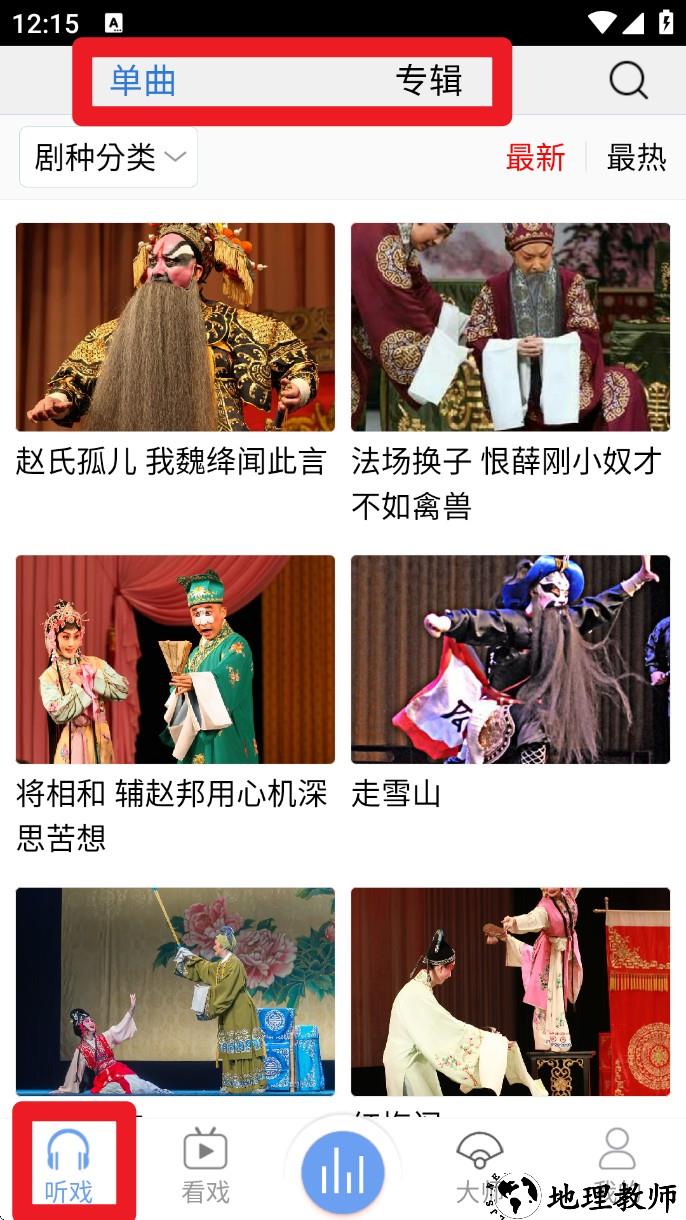 1. 在首页点击左下角听戏,默认进入单曲播放区,可切换到专辑查看完整曲集,浏览各类经典选段。