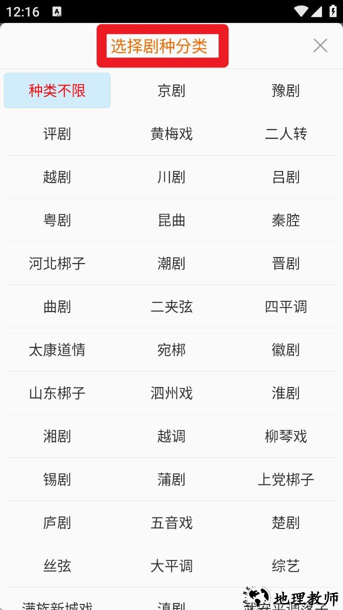 3. 点击上方剧种分类按钮会弹出选择页,提供京剧、黄梅戏、越剧、评剧等数十种地方戏曲供精准筛选。