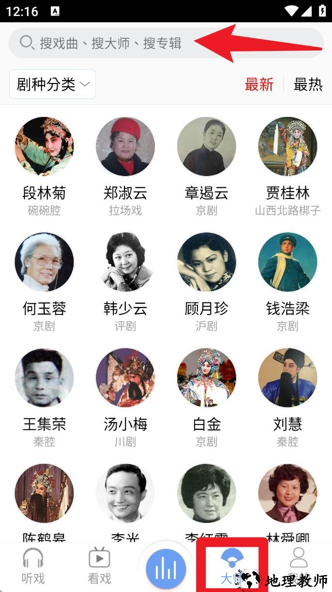 4. 进入大师栏目,可根据头像浏览不同戏曲名家,点击头像查看代表剧目或直接使用上方搜索框查找作品。