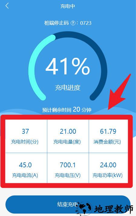5、充电过程中实时显示充电进度、电流、电压、功率与消费金额,用户可随时查看并在需要时手动结束充电。