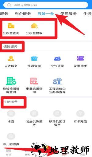 5、在服务页面中,点击五险一金,可使用公积金查询与提取、生活缴费等功能,覆盖水费、热费话等缴费场景。