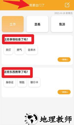 3、进入我要出门了功能后,可选择出行场景,如工作、旅游等,勾选事项与物品清单避免遗漏。