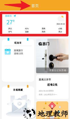 2、在首页可查看实时天气、出行提醒、纪念日倒计时及节日提醒,帮助用户合理安排日程。