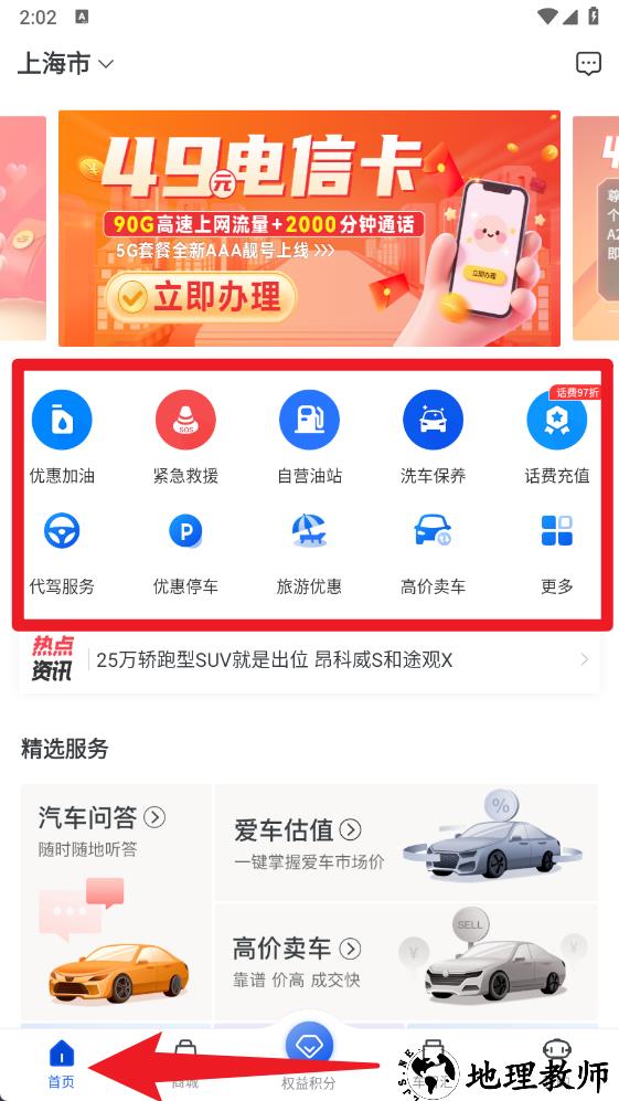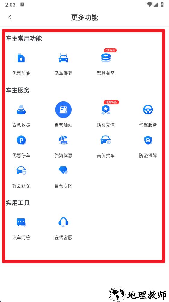 2、在首页功能区,用户可以便捷使用优惠加油、紧急救援、自营油站、洗车保养等服务,满足日常出行需求。