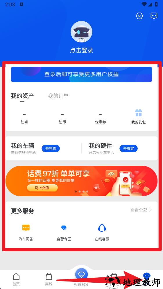 5、进入我的页面,用户可查看个人资产、车辆信息和硬件设备,支持优惠券领取及更多服务,便于统一掌控。