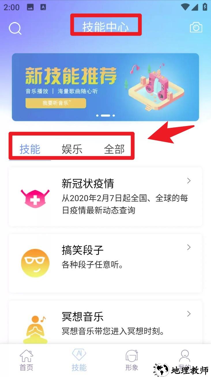 3. 切换到底部技能栏目,在技能中心浏览推荐内容,也可点击分类标签快速筛选。