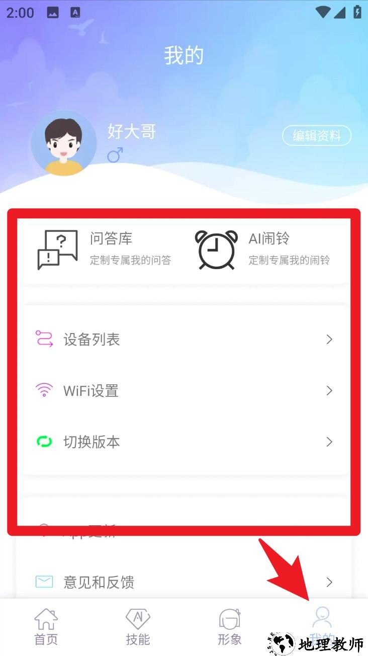 4. 前往我的页面,可查看设备列表、设置 wifi、切换版本或使用自定义闹钟功能。