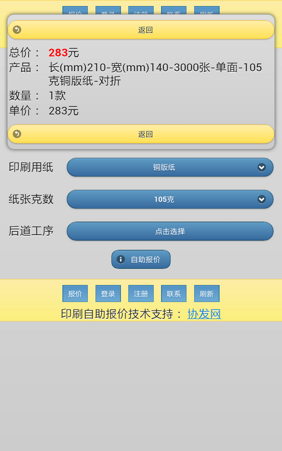 容易出错。而协发自助印刷报价手机软件利用用户输入或者选择的规格、数量、印刷单双面、