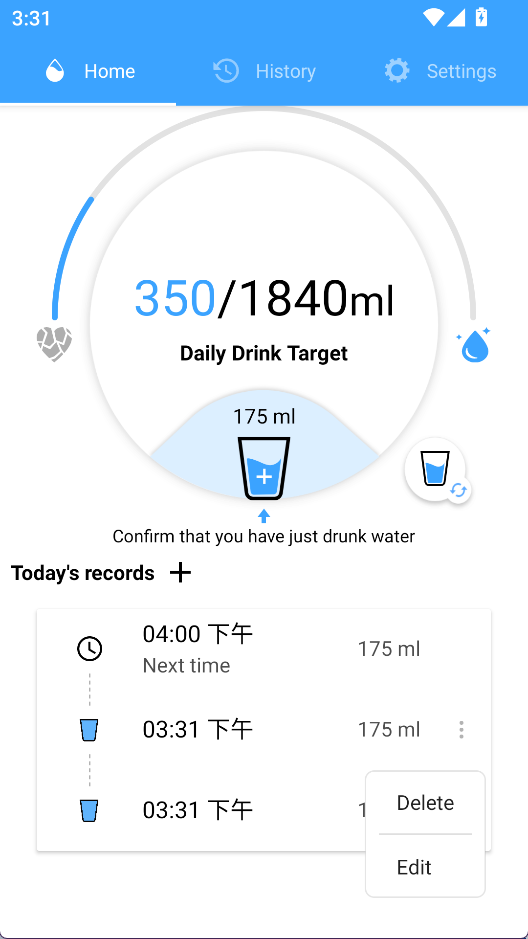 2、饮水量记录:每次喝水后可手动添加摄入量,系统会自动累计当日总饮水量。
