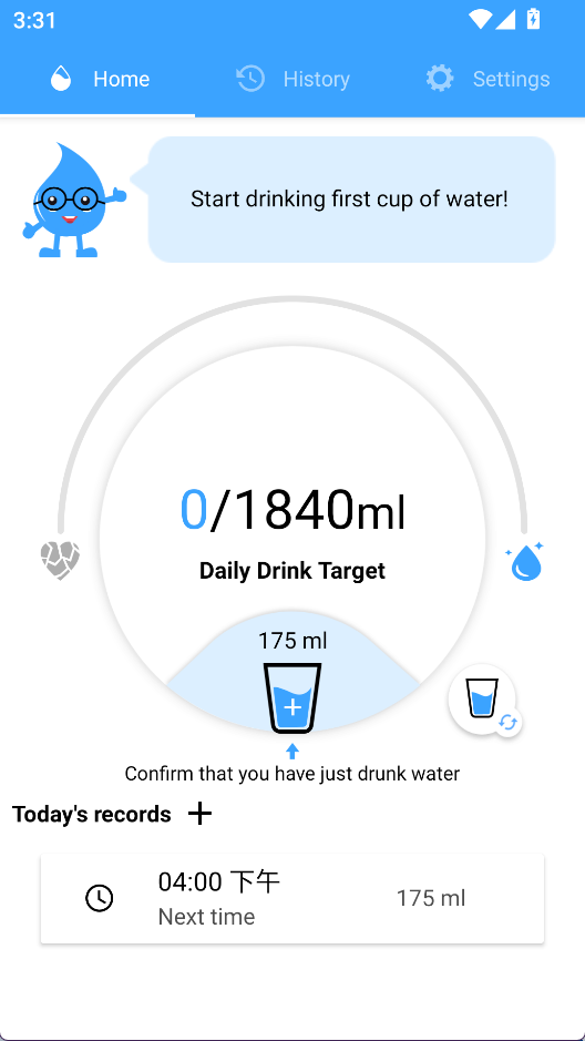 1、初次使用设基础目标:根据体重和活动量设定一个合理的每日饮水总量作为起点。
