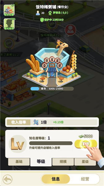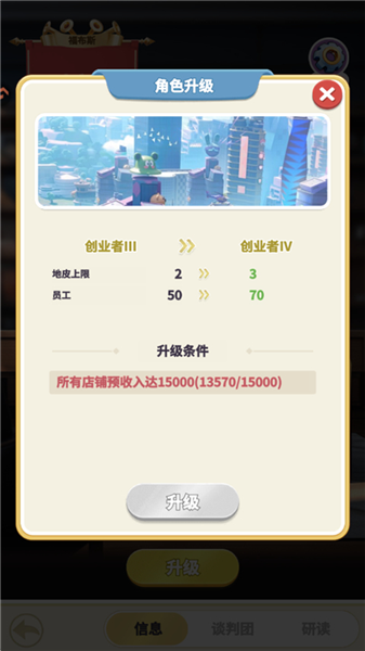 宣传店铺获得知名后可升级店铺,店铺等级虽然不能带来直接的加成,但是可以直接提升店铺收入倍率提升,最多可以获得3倍的店铺收入!