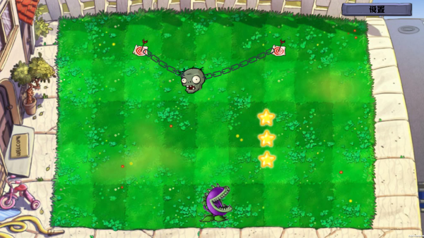 2、第一关比较简单,横着划掉锁链垂直掉落至吃人花,将僵尸消灭掉,顺便获得三颗星星。通关成功!