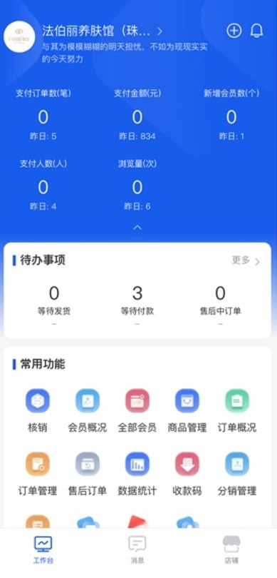 1、工作台展示店铺数据概况,可查看订单付款数与付款金额统计。