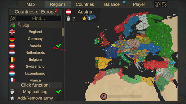 3、在regions里选择一个你需要掌权的国家
