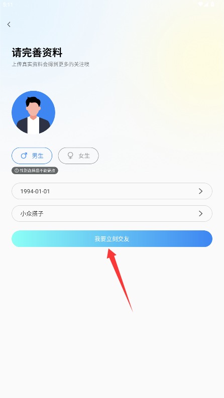 2、进入个人资料页完善信息,上传头像并填写性别、生日等基本信息后保存设置。