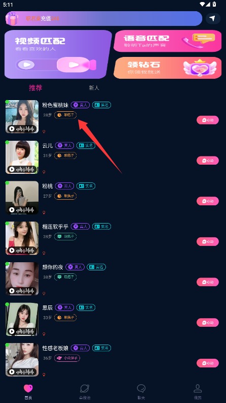 3、在推荐页浏览系统匹配的附近用户,点击感兴趣的用户头像查看详细资料。