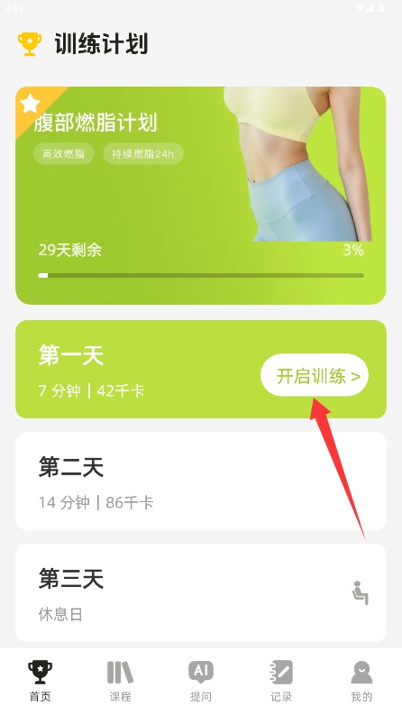 3、在应用主界面点击开始今日训练按钮,即可开始进入课程选择页面准备锻炼。