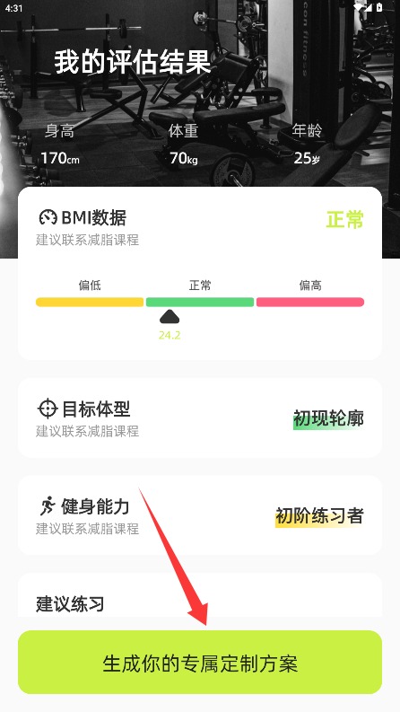 2、根据个人身高体重、运动习惯等基本信息,系统将自动生成专属的智能健身方案。