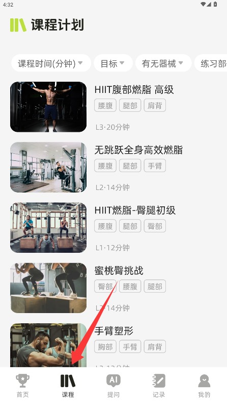 4、训练课程:内置专业教练设计的多样化训练课程,按部位、难度分类,支持自定义训练组合。