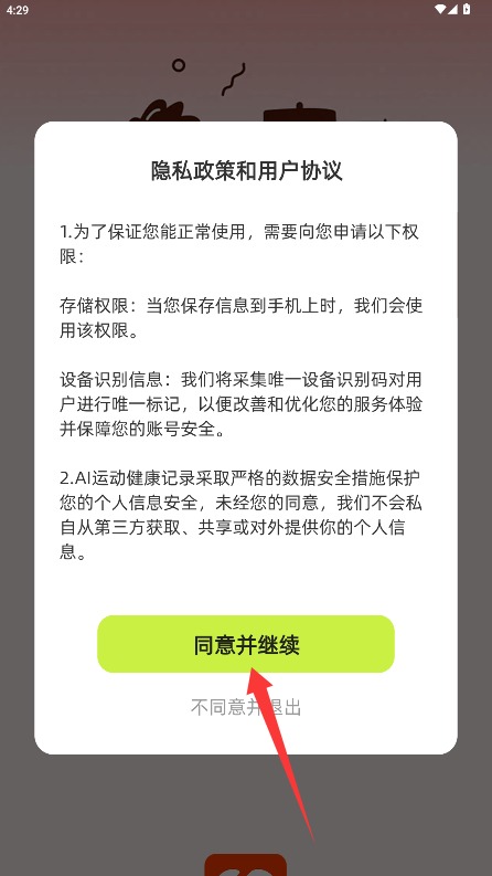 1、初次使用需阅读平台服务条款与隐私政策,确认后点击同意并继续按钮进入应用。