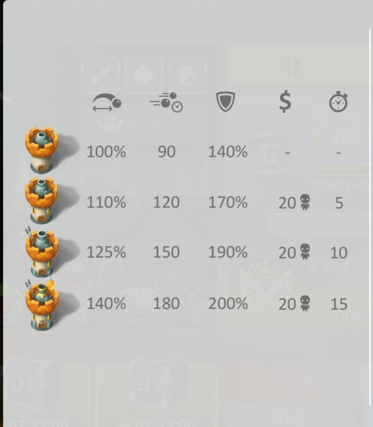 炮塔1升2射程增加百分之十,射速增加三十,防御增加百分之三十,