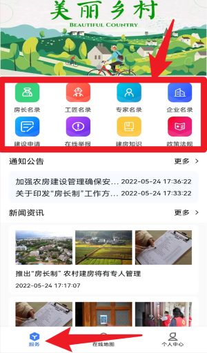 3、在服务页面中,可查看房长名录、工匠名录、专家名录、企业名录等模块,还能进行建设申请、在线举报及政策法规学习。