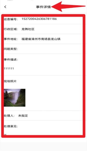 5、在事件详情页面中,用户能查看巡查编号、地址、问题类型、事件描述及现场照片,支持后续处理人和处理意见的记录。